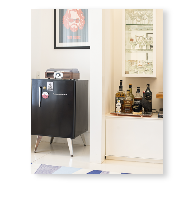 Como é um apartamento alugado, não pude mexer nos revestimentos (piso e parede), o que foi um desafio à parte. As colunas com o mosaico de madeira são bem marcantes e não poderiam ser ignoradas. Usei móveis em madeira ou em cor similar (como o couro do puff) para que a madeira da parede tivesse uma relação com os móveis e deixasse de se destacar tanto. O tapete colorido e com geometria bem marcante foi outra forma de tirar um pouco o olhar das paredes e trazer para o piso. O ambiente ficou masculino, porém aconchegante e divertido, e com a cara do dono!