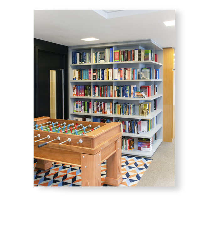 O escritório cresceu e a expansão não foi mais o suficiente. Os clientes alugaram um espaço maior e começamos mais um projeto do zero. Tinha quer ser “descolado” com uma área de convívio para os funcionários que funcionasse como o “coração” do escritório, com direito a mesa de sinuca, sofá para se jogar, bar com chopeira e tudo isso dividindo espaço com a biblioteca do escritório.