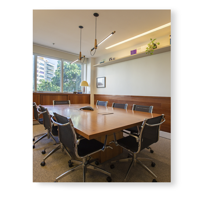 Esse escritório foi feito com muito carinho para pessoas muito queridas na minha vida. Uma dupla de advogadas que estavam encarando uma nova fase de vida e precisavam de um espaço com a cara delas. Visitamos vários imóveis juntas e encontramos uma sala comercial que já tinha toda a base pronta e com uma iluminação natural impecável. Bastava adequá-lo ao uso delas e dar aquele toque para ficar mais aconchegante. A ideia é que fosse um espaço gostoso de trabalhar, sem aquele ar frio e sisudo que encontramos em vários escritórios. A presença forte de elementos naturais, como a madeira natural, o tapete de fibras naturais na recepção e o detalhe em couro “costurando” a estante, que também funciona como divisória, deram uma sensação de aconchego que te abraça e as pessoas se sentem bem recebidas. Já os detalhes de design, como a linda luminária pendente na sala de reunião e o relógio de parede que ficava no antigo apartamento da cliente, trouxeram a personalidade das clientes para o espaço. A sensação quando se entra no ambiente é que você está visitando a casa de alguém. A sensação é literalmente de que você está trabalhando de casa.