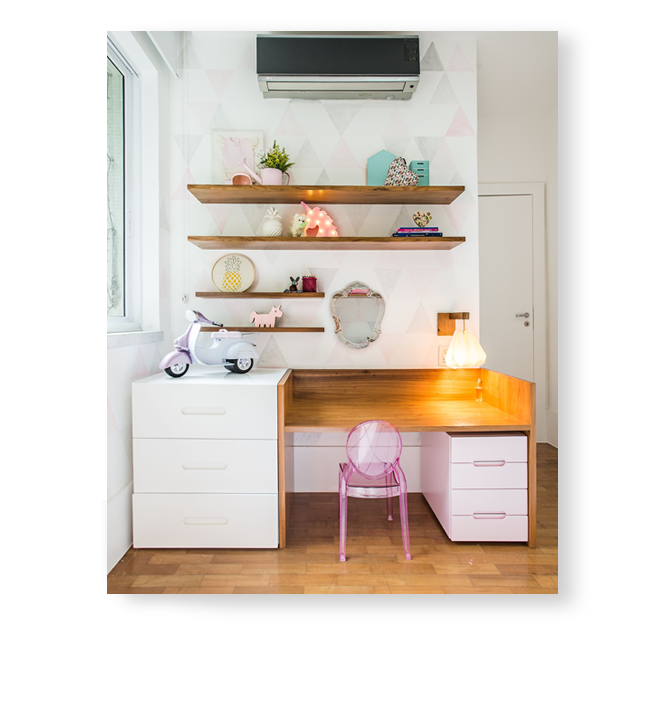 As irmãs trocaram de quarto para que as gêmeas mais novas ocupassem um espaço maior e a irmã mais velha tivesse um espaço só dela. Aproveitei ao máximo os móveis existentes dando apenas uma repaginada. No quarto da irmã mais velha, por exemplo, mantive a escrivaninha original dela, desenhando um novo gaveteiro como se fosse uma versão mini da cômoda branca que ela já usava no outro quarto para guardar os brinquedos. Coloquei todas as peças juntas, uma ao lado da outra, como se fosse tudo um único móvel. E como a mini cliente era super vaidosa, a escrivaninha também deveria funcionar como penteadeira. O espelho rococó deu aquele ar feminino e a arandela com luz difusa tem o propósito de iluminar a mesa para o estudo e o rosto para a maquiagem.