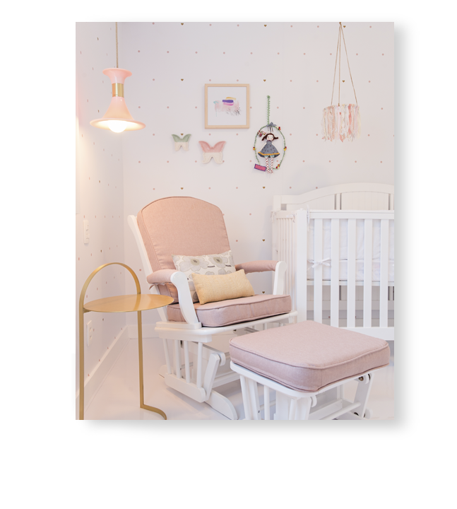 As paredes foram revestidas com um papel de parede bem delicado feito sob medida (até a tonalidade do rosa antigo nós escolhemos a dedo). Os móveis nós aproveitamos do quarto do primeiro filho e apenas pintamos e mudamos a roupagem para ficar com uma cara mais feminina, trocando os puxadores, por exemplo, que são rosas e super delicados. Os tecidos escolhidos foram todos naturais e em tonalidades claras, mas como não sou de ferro, dei aquele toque mais moderninho com a luminária pendente e a mesinha lateral com detalhe dourado e uma parte da marcenaria em madeira natural. Usei a madeira pinus em razão da cor mais clara, para o contraste ser menor e o ambiente continuar com aquela sensação mais calma e fluida. Os itens de decoração também fugiram um pouco do clássico ...usei até saleiro e pimenteiro para decorar as prateleiras e um vaso fixo na parede com acabamento dourado porque a minha alma mais rock n’roll não se aguenta!
