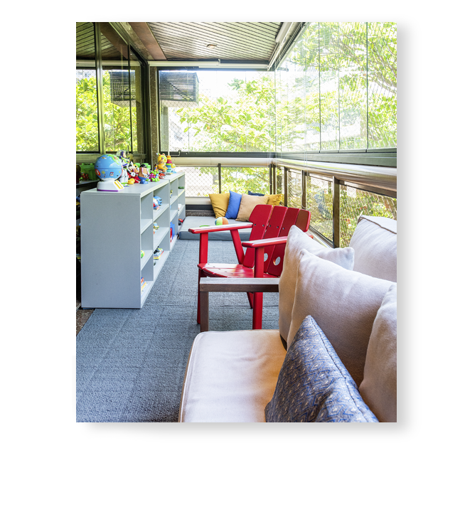 A marcenaria sob medida foi crucial no projeto, pois abrigou os brinquedos de um lado da varanda e criou espaço para receber os amigos do outro lado. Tudo junto e misturado, porém setorizado. Assim fica cada um no seu quadrado.