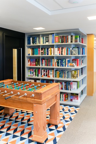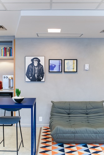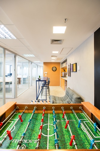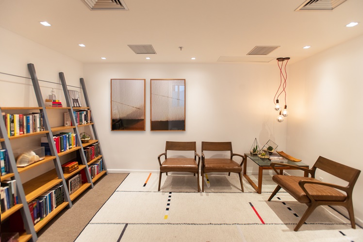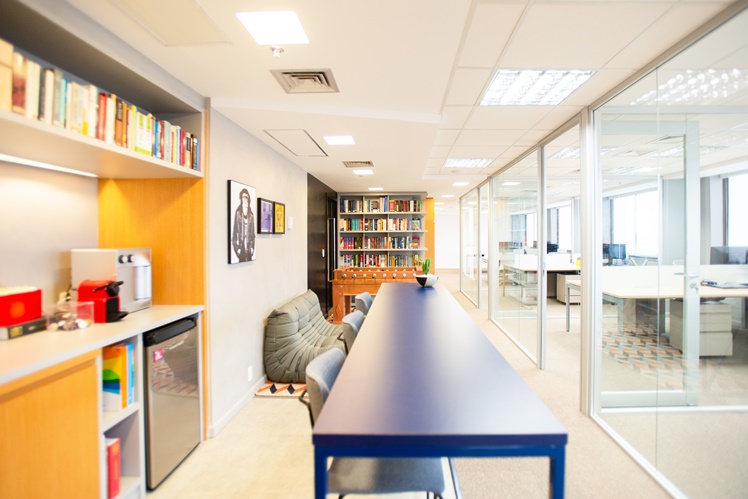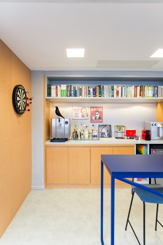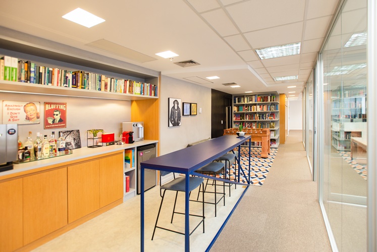 O escritório cresceu e a expansão não foi mais o suficiente. Os clientes alugaram um espaço maior e começamos mais um projeto do zero. Tinha quer ser “descolado” com uma área de convívio para os funcionários que funcionasse como o “coração” do escritório, com direito a mesa de sinuca, sofá para se jogar, bar com chopeira e tudo isso dividindo espaço com a biblioteca do escritório.