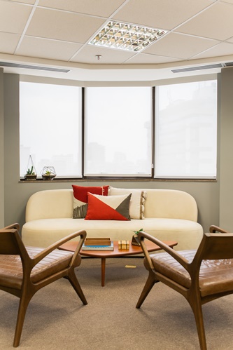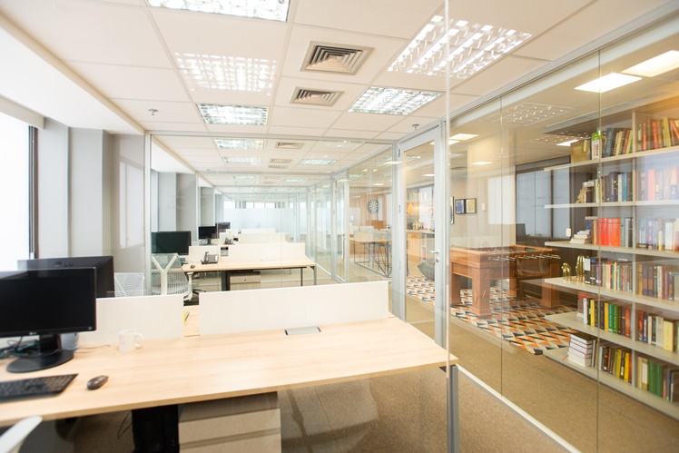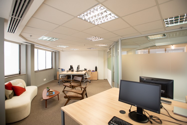A área de trabalho foi definida por divisórias de vidro. A ideia inicial era fazer um espaço único de trabalho, com todos juntos, mas a necessária confidencialidade de alguns casos tratados no escritório fez com que optássemos por divisórias de vidro. Dessa forma todos tinham a sensação de estarem juntos, mas ao mesmo tempo com a privacidade mantida.