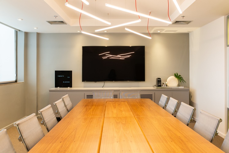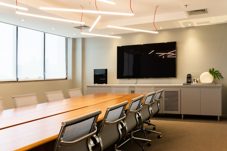 A sala de reunião também se transformou em um ponto focal do escritório com iluminação feita sob medida para ela. Os pendentes foram posicionados de forma estratégica para dar um movimento diferente ao teto e tirar aquele ar de seriedade de uma sala de reunião de advogados. Os móveis eles herdaram do escritório anterior e demos apenas uma repaginada.
