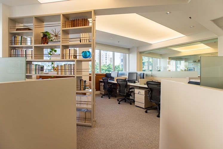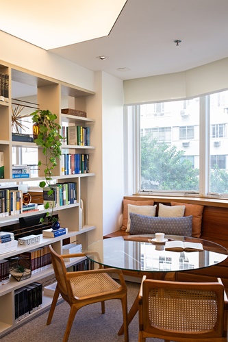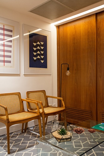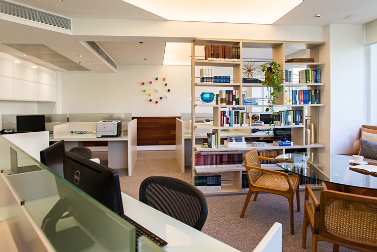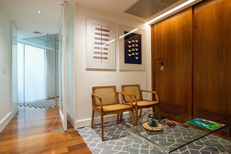 Esse escritório foi feito com muito carinho para pessoas muito queridas na minha vida. Uma dupla de advogadas que estavam encarando uma nova fase de vida e precisavam de um espaço com a cara delas. Visitamos vários imóveis juntas e encontramos uma sala comercial que já tinha toda a base pronta e com uma iluminação natural impecável. Bastava adequá-lo ao uso delas e dar aquele toque para ficar mais aconchegante. A ideia é que fosse um espaço gostoso de trabalhar, sem aquele ar frio e sisudo que encontramos em vários escritórios. A presença forte de elementos naturais, como a madeira natural, o tapete de fibras naturais na recepção e o detalhe em couro “costurando” a estante, que também funciona como divisória, deram uma sensação de aconchego que te abraça e as pessoas se sentem bem recebidas. Já os detalhes de design, como a linda luminária pendente na sala de reunião e o relógio de parede que ficava no antigo apartamento da cliente, trouxeram a personalidade das clientes para o espaço. A sensação quando se entra no ambiente é que você está visitando a casa de alguém. A sensação é literalmente de que você está trabalhando de casa.