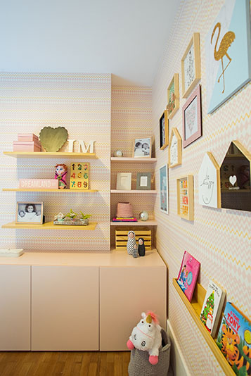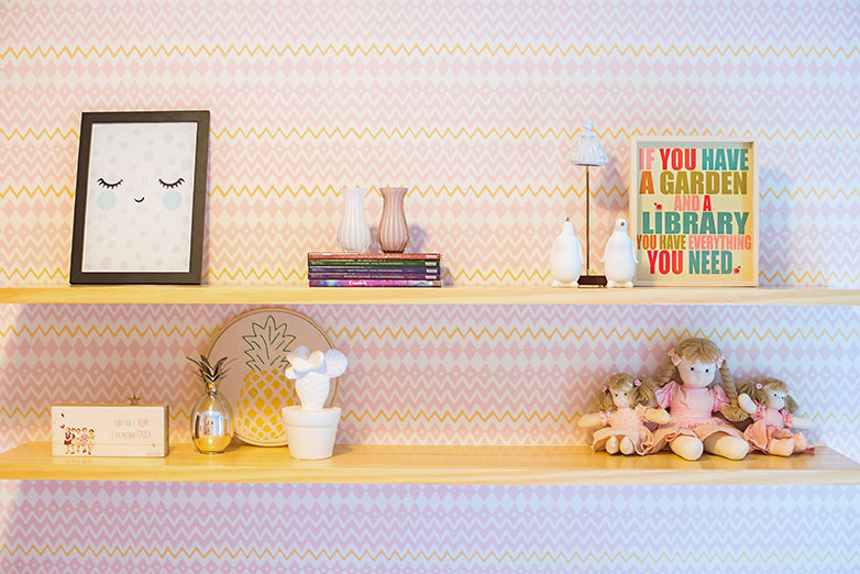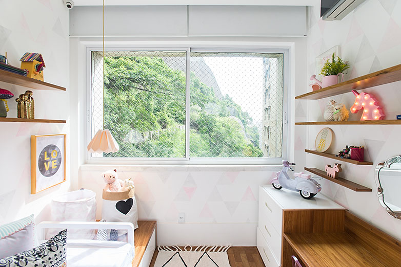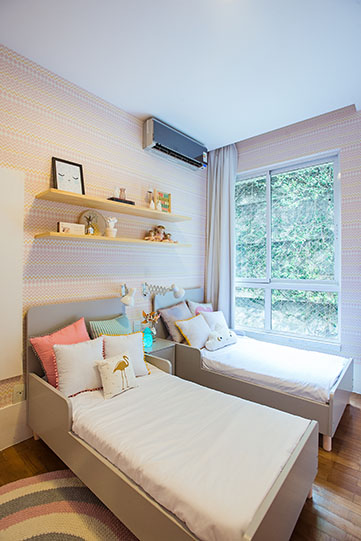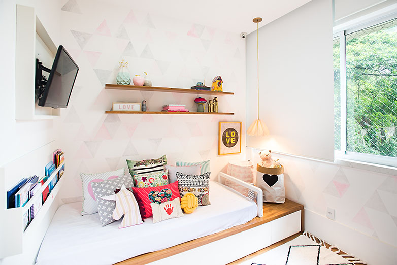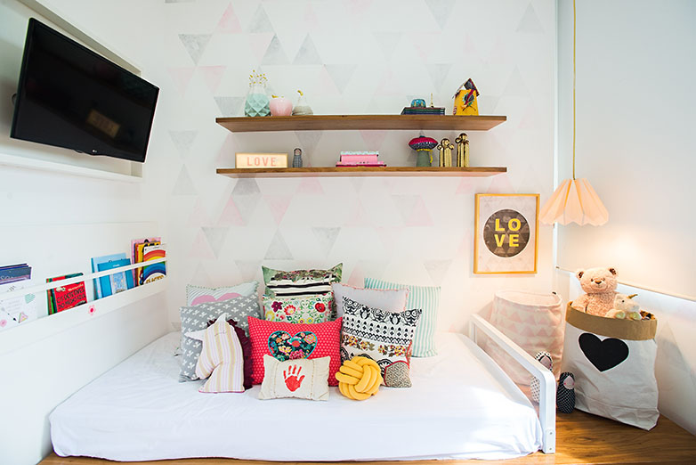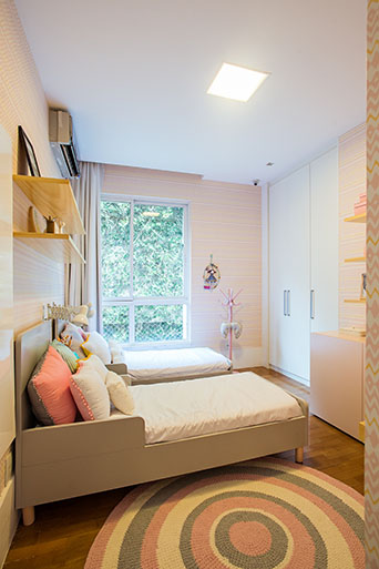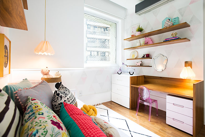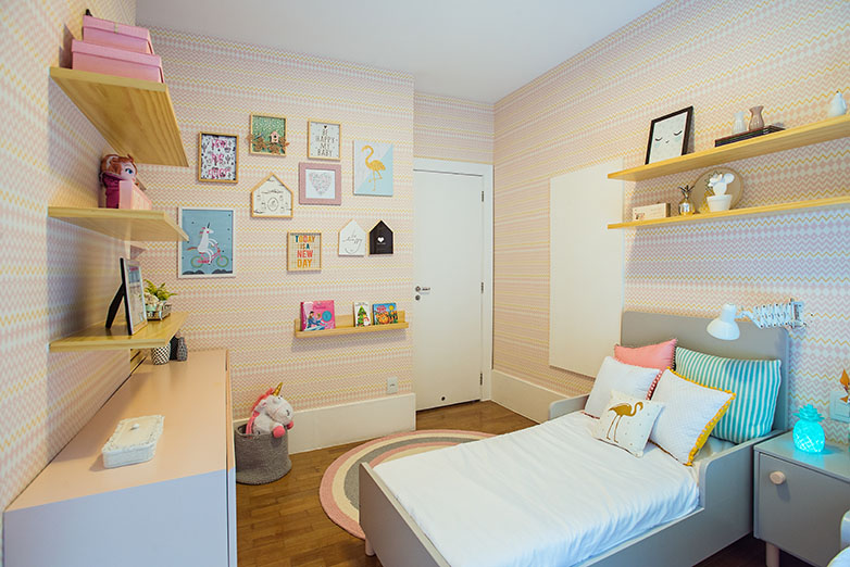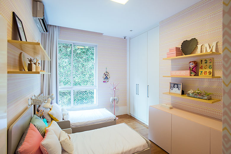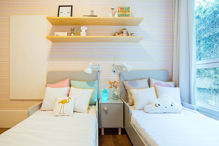 O quarto das irmãs mais novas tinha que ser colorido, igual a elas, e as duas ganharam camas novas, pois antes dormiam em uma bicama. O papel de parede trouxe personalidade e cor para o espaço. A base dos móveis teve que ser mais sóbria, mas os detalhes também eram bem coloridos e elas amaram.