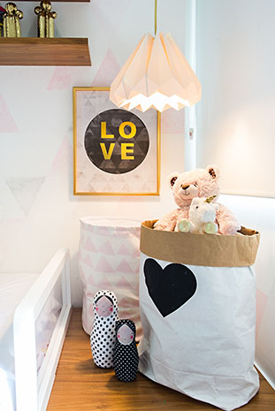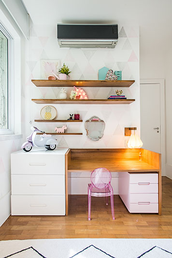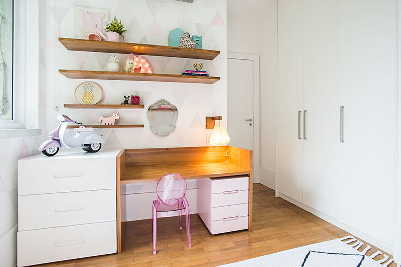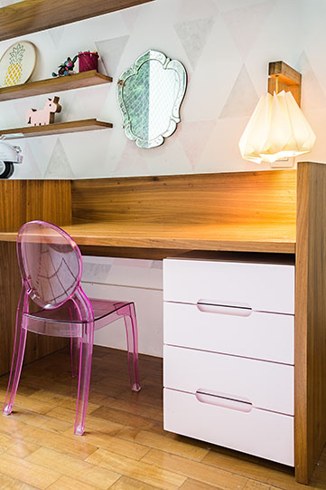 As irmãs trocaram de quarto para que as gêmeas mais novas ocupassem um espaço maior e a irmã mais velha tivesse um espaço só dela. Aproveitei ao máximo os móveis existentes dando apenas uma repaginada. No quarto da irmã mais velha, por exemplo, mantive a escrivaninha original dela, desenhando um novo gaveteiro como se fosse uma versão mini da cômoda branca que ela já usava no outro quarto para guardar os brinquedos. Coloquei todas as peças juntas, uma ao lado da outra, como se fosse tudo um único móvel. E como a mini cliente era super vaidosa, a escrivaninha também deveria funcionar como penteadeira. O espelho rococó deu aquele ar feminino e a arandela com luz difusa tem o propósito de iluminar a mesa para o estudo e o rosto para a maquiagem.