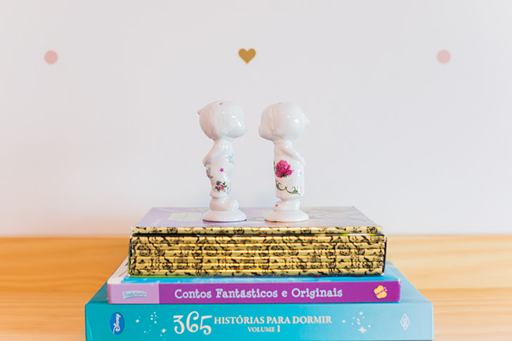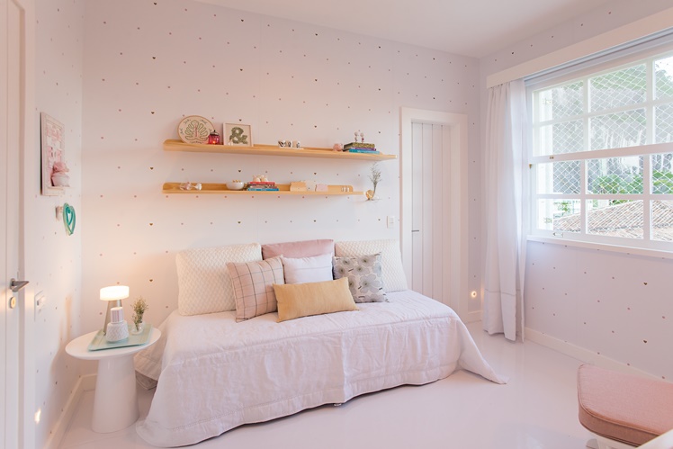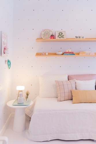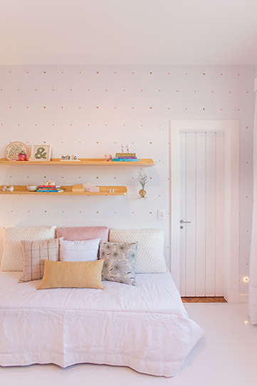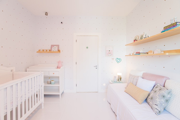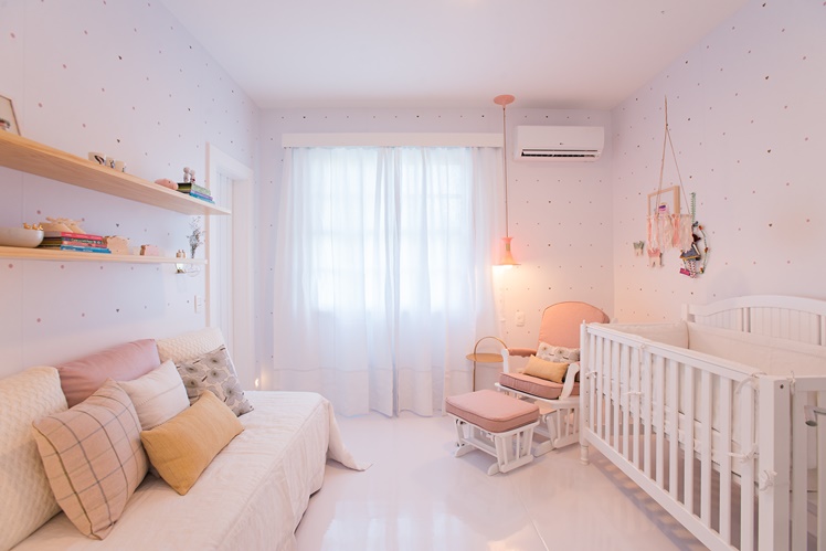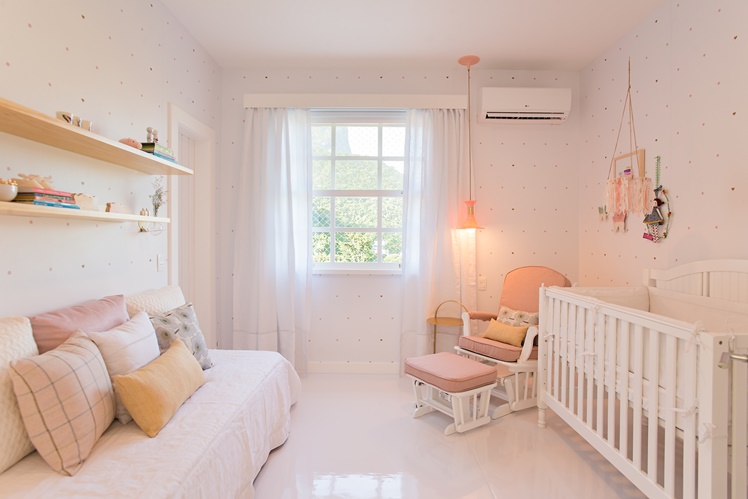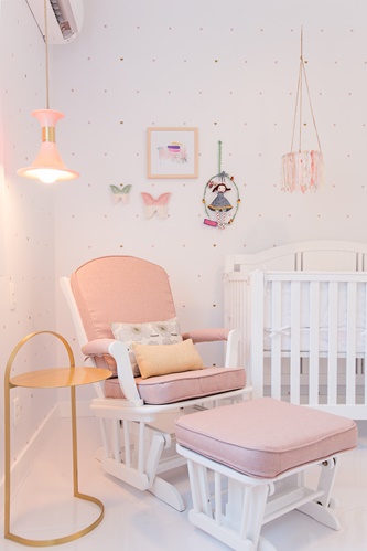 As paredes foram revestidas com um papel de parede bem delicado feito sob medida (até a tonalidade do rosa antigo nós escolhemos a dedo). Os móveis nós aproveitamos do quarto do primeiro filho e apenas pintamos e mudamos a roupagem para ficar com uma cara mais feminina, trocando os puxadores, por exemplo, que são rosas e super delicados. Os tecidos escolhidos foram todos naturais e em tonalidades claras, mas como não sou de ferro, dei aquele toque mais moderninho com a luminária pendente e a mesinha lateral com detalhe dourado e uma parte da marcenaria em madeira natural. Usei a madeira pinus em razão da cor mais clara, para o contraste ser menor e o ambiente continuar com aquela sensação mais calma e fluida. Os itens de decoração também fugiram um pouco do clássico ...usei até saleiro e pimenteiro para decorar as prateleiras e um vaso fixo na parede com acabamento dourado porque a minha alma mais rock n’roll não se aguenta!