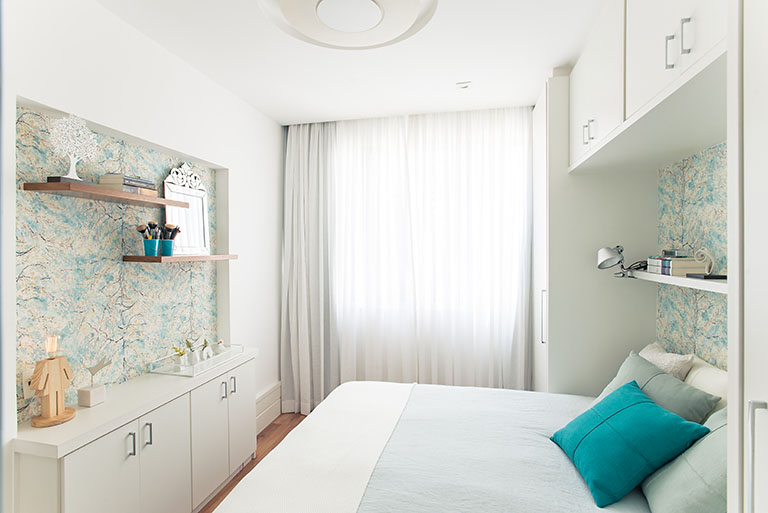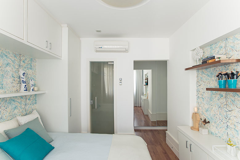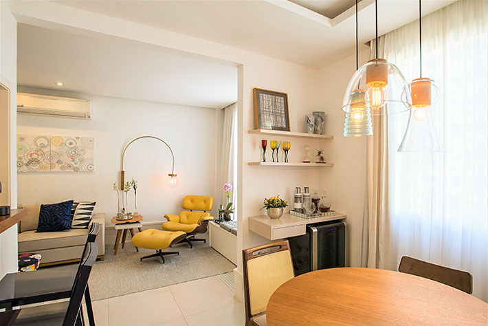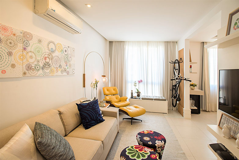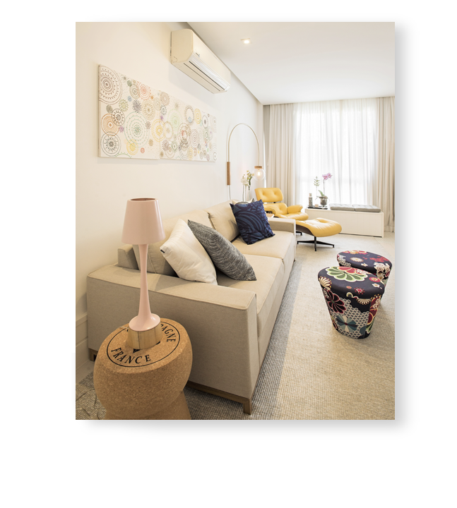Um trabalho de muita responsabilidade para um apartamento de uma cliente solteira, pois representava um novo capítulo em sua vida depois de momentos anteriores de muita dificuldade. Deveria ser algo leve e com toques de cor, aproveitando a marcenaria existente, que recebeu alguns incrementos, além de marcenaria nova em folha de madeira natural para contrastar com o a laca branca existente e quebrar aquela sensação de ambiente quase estéril (pelo menos essa é a sensação que laca branca em excesso me dá.. rs). O resultado foi um apartamento leve, delicado e feminino, com alguns toques hard core, como a bicicleta pendurada na sala, representando bem a personalidade da dona. O mais bacana é que o novo capítulo foi tão bom que a cliente depois se mudou e fiz o projeto para um novo apartamento, para dois!