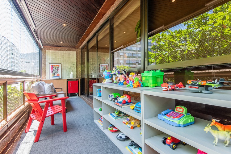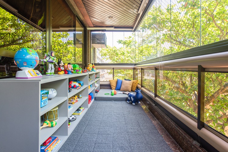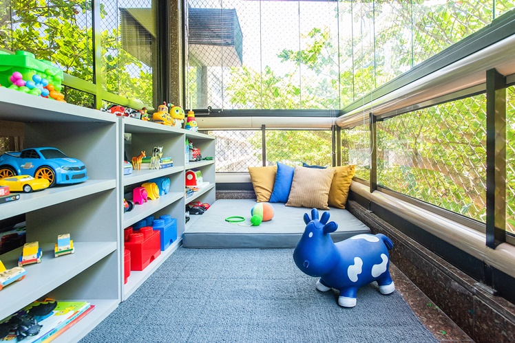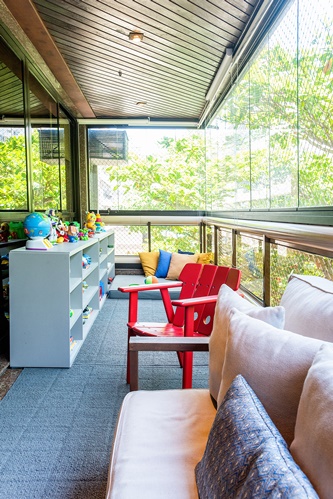 A marcenaria sob medida foi crucial no projeto, pois abrigou os brinquedos de um lado da varanda e criou espaço para receber os amigos do outro lado. Tudo junto e misturado, porém setorizado. Assim fica cada um no seu quadrado.