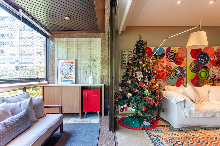 O pedido era simples: tirar os brinquedos da sala e aumentar o espaço para receber os adultos em casa sem fazer obra. Não era muito óbvio o que fazer, mas não tive dúvidas e abri a sala para a varanda. Criei um espaço para as crianças em um canto da varanda que fica mais longe da sala e coloquei um sofá de área externa, mas com cara de área interna, virado para a sala. No piso da varanda entrou um tapete para área externa, também com cara de área interna, que acabou camuflando a diferença nos pisos da sala e da varanda, além de dar mais conforto para as crianças brincarem e um ar mais sofisticado para a varanda. Quando as portas da sala para a varanda são abertas, parece que a sala dobra de tamanho e tem lugar para todos sentarem e conversarem.