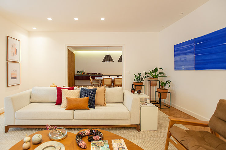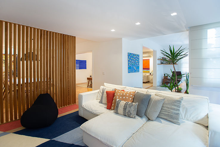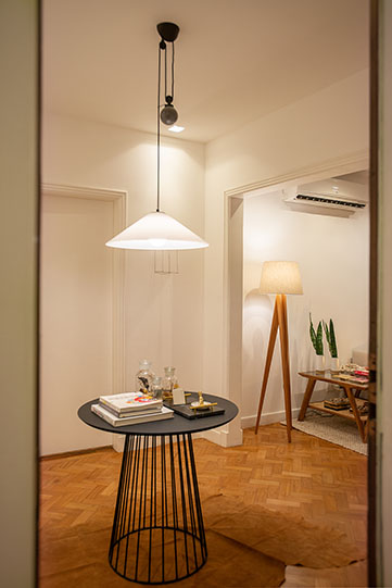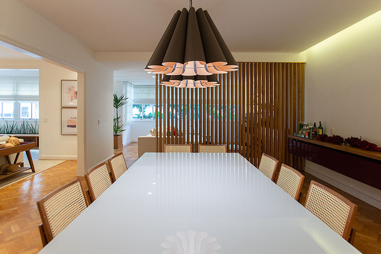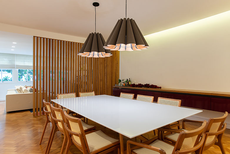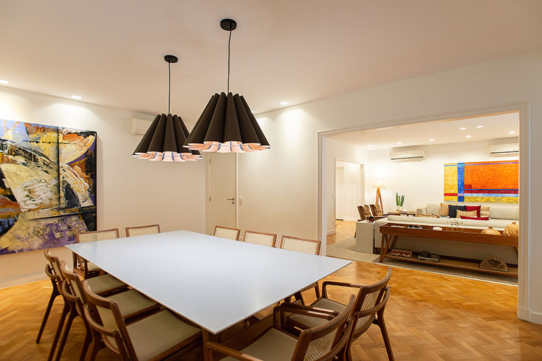 Sabe aqueles apartamentos antigos em Copacabana que você chega a se perder dentro? Todos os espaços são generosos, tanto que transformamos uma varanda (que já era fechado com janelas) em uma sala de televisão. Só que o apartamento era bem antigo e não tinha lavabo, não tinha suítes e a cozinha era toda compartimentada. Foi um projeto desafiador pois transformamos 3 quartos e 3 banheiros em 4 quartos, sendo 3 suítes mais um banheiro separado e um lavabo. A cozinha foi toda aberta e renovada e hoje conta com uma ilha generosa e até mesmo uma churrasqueira. Para criar a sala de televisão aonde antes era parte da varanda com piso de pedra, “roubamos” o piso de taco de um dos quartos de serviço (sim, tinha mais de um) que transformamos em banheiro para a nova suíte do casal e levamos para a varanda. Assim uniformizamos o piso para que o ambiente não parecesse ser um anexo, ficando inteiramente integrado aos demais espaços da área social. A obra durou quase 1 ano e meu filho nasceu no meio do caminho, mas deu tudo certo porque os clientes são maravilhosos e ainda contei com a colaboração de uma amiga arquiteta para tocar o projeto enquanto eu cuidava do meu mini projeto de gente. A produção e as fotos eu acho que fiz uns dois anos depois da mudança dos clientes, mas somente da área social, o que já deu um trabalho imenso. Quem sabe um dia não consigo retornar para fotografar o resto?