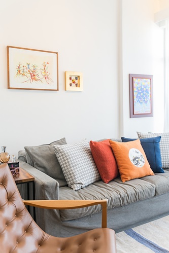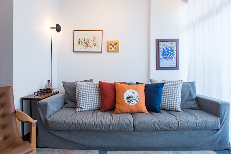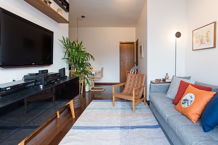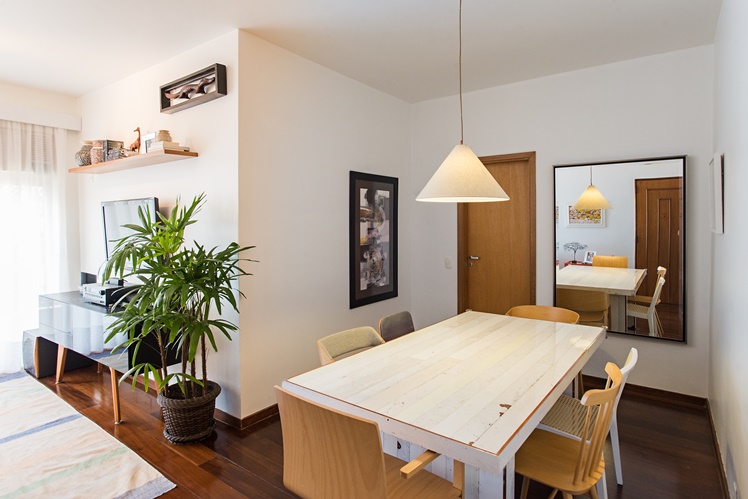 A cliente fez um único pedido: vamos aproveitar ao máximo os móveis do antigo apartamento no novo espaço. Tirei a medida de absolutamente todos os móveis e aproveitamos quase tudo. Acho que somente as luminárias, o quarto da nova filha que estava para chegar e a marcenaria do quarto dela foram novos. Nos demais espaços conseguimos aproveitar o que ela já tinha, inclusive dando novos propósitos para os móveis. Um espelho que ficava na horizontal em cima de um aparador foi para a sala de jantar, de frente para a entrada do apartamento, mas na vertical. A posição foi estratégica para dar aquela sensação ilusória de espaço maior. O aparador, por sua vez, se transformou em um rack e assim fomos reaproveitando e dando novos usos aos móveis. O espaço ficou charmoso e aconchegante.